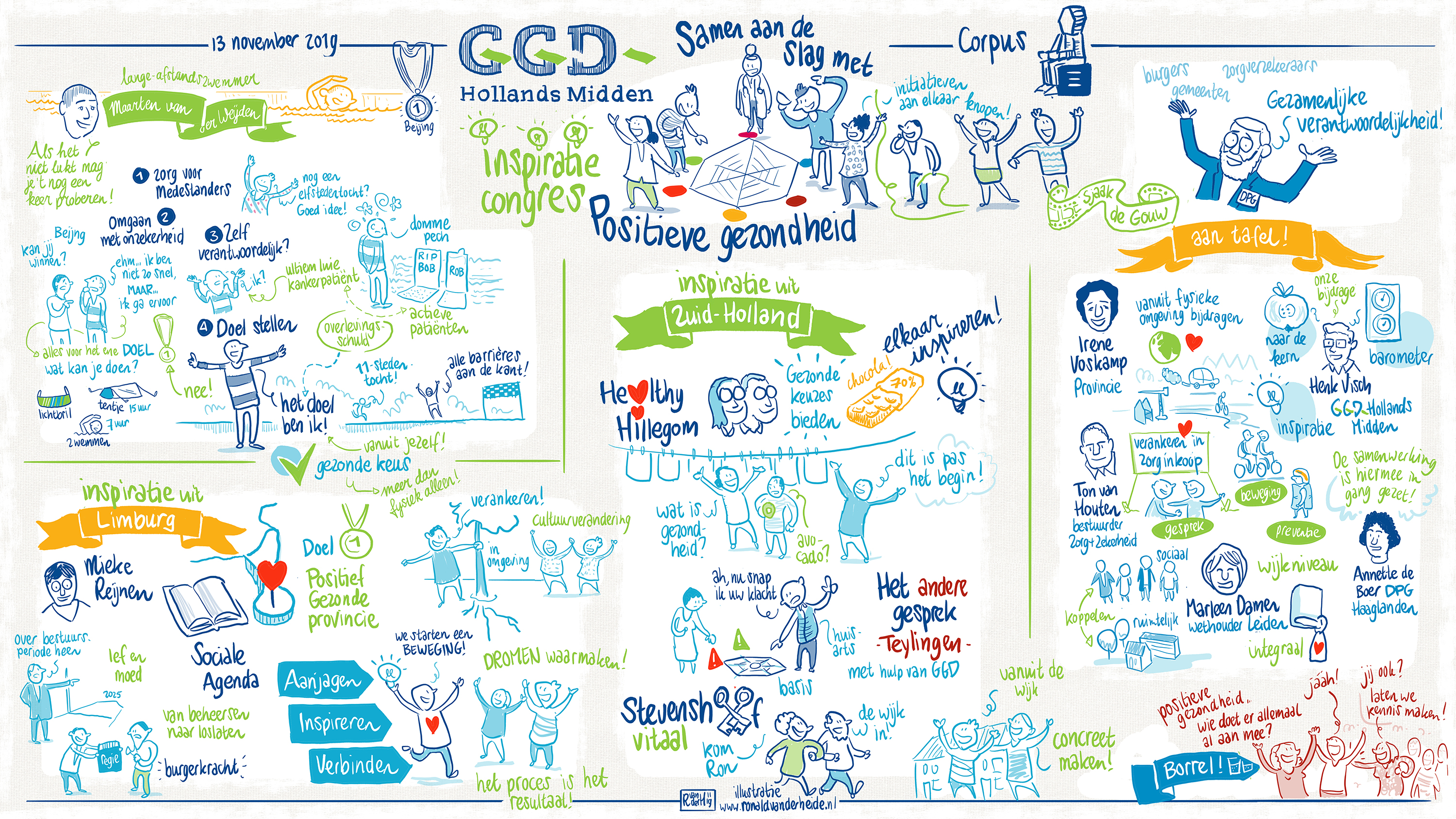 Het inspiratiecongres 'Samen aan de slag met Positieve Gezondheid' is achter de rug en dat leverde zoals verwacht meer dan voldoende stof op om mee aan de slag te gaan! De Hillegomse wethouder Fred van Trigt leidde de aanwezigen in een prachtig aangekleed Corpus door het congres heen. Maarten van der Weijden maakte als inspirerend gastspreker grote indruk met zijn verhaal over tegenslagen, doorzettingsvermogen en zijn heldere blik op de toekomst.